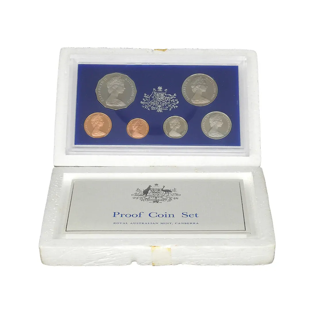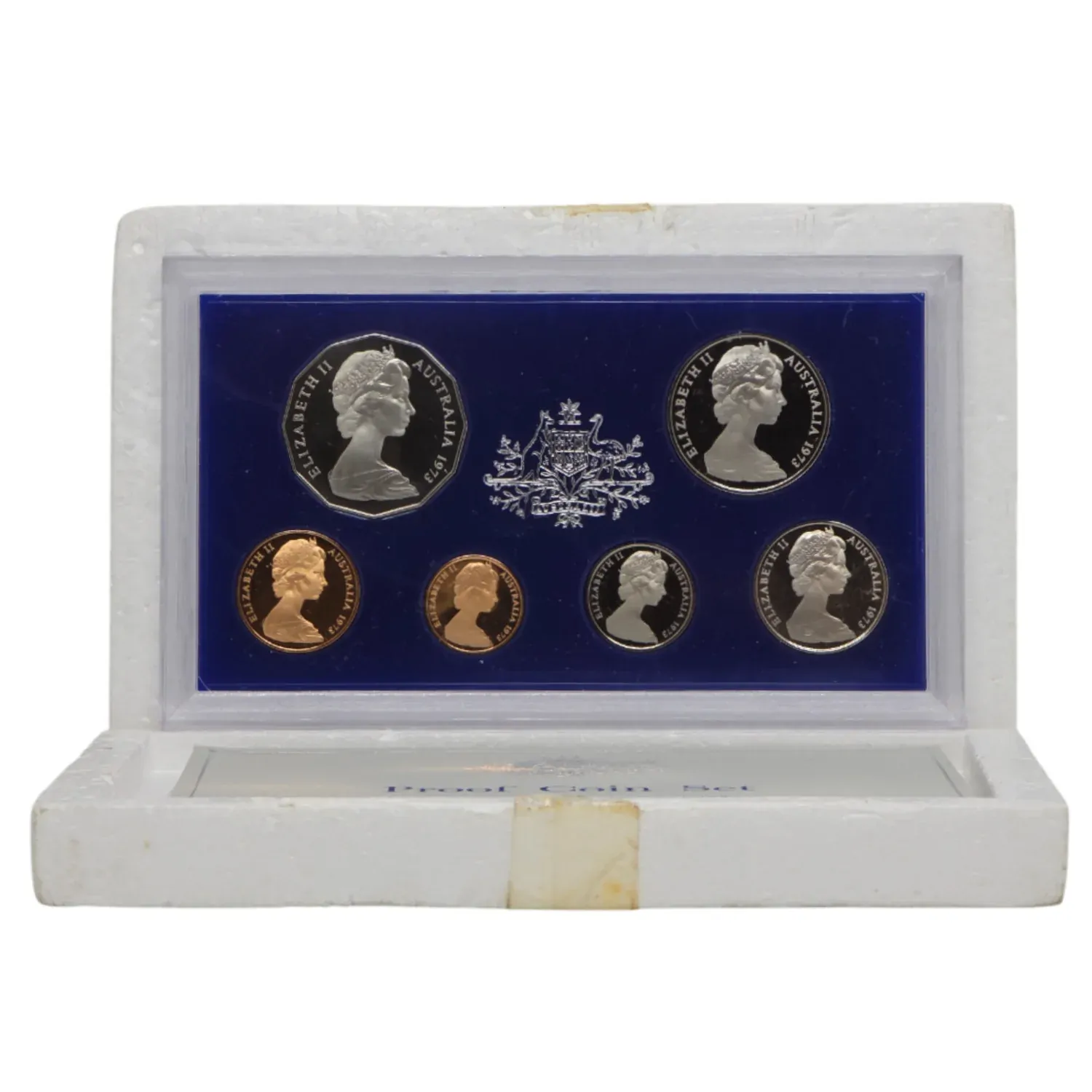 The 1973 proof set of Australia's circulating coins, the consists of one of each of the following denominations: one cent, two cents, five cents, ten cents, twenty cents and fifty cents.