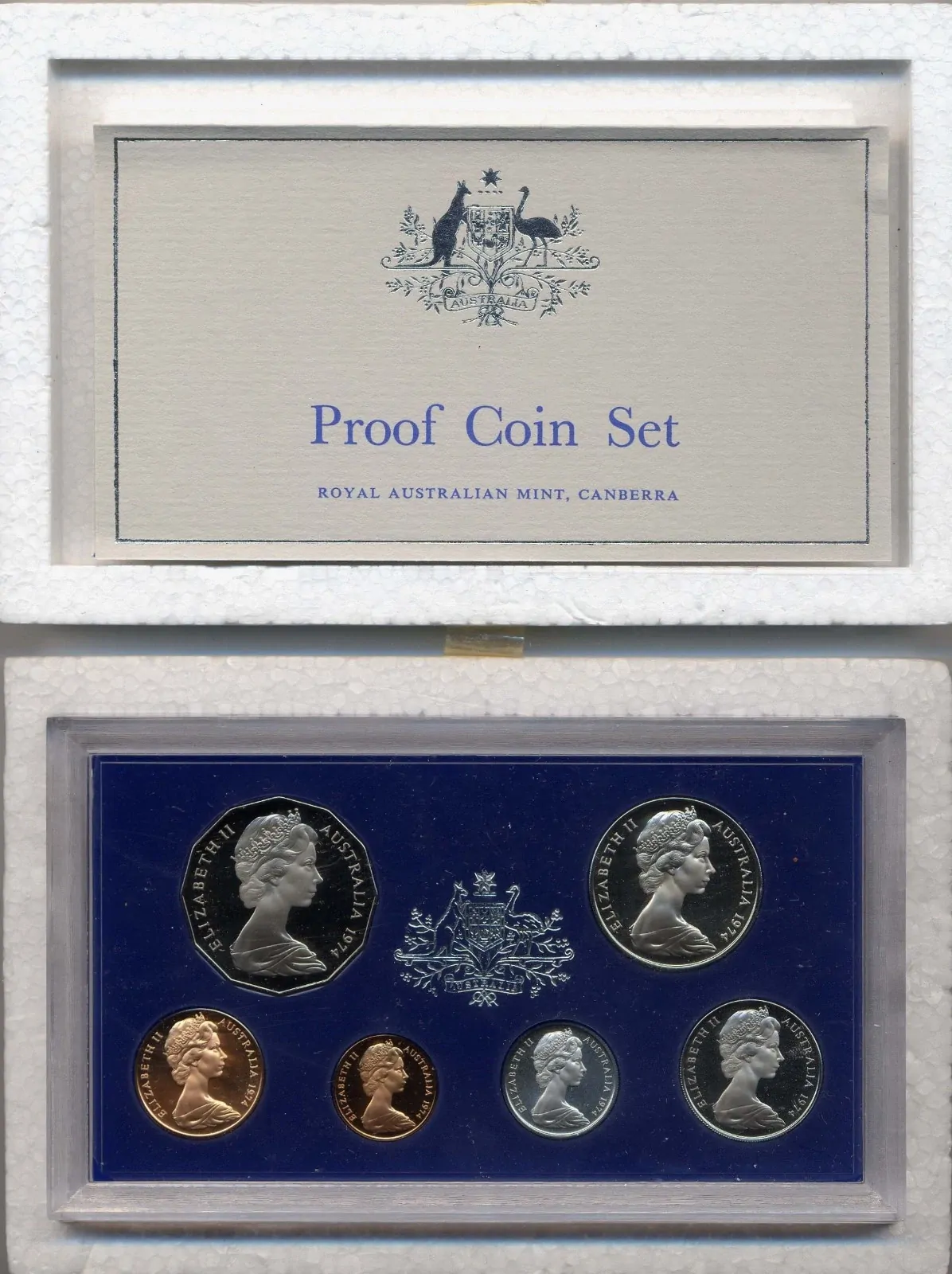 The 1974 proof set consists of 6 Australian proof coin, the consists of one of each of the following denominations: one cent, two cents, five cents, ten cents, twenty cents and fifty cents.