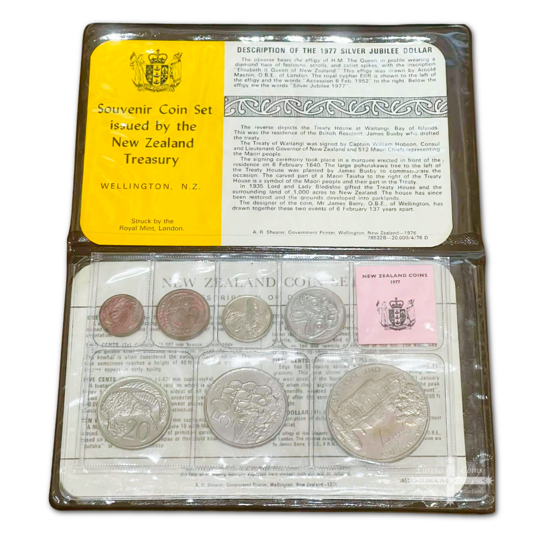 1977 Royal Mint New Zealand 7 coin year set in wallet.The set includes a special coin issue commemorating both the Treaty of Waitangi and the Silver Jubilee of Queen Elizabeth II.