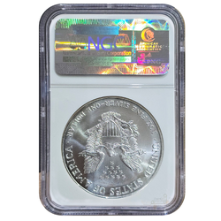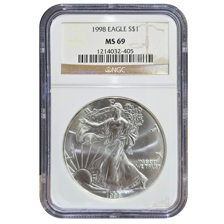 This 1oz American Silver Eagle has been graded a near perfect Mint State (MS69) by NGC. The Silver Eagle is a popular American coin, highly sort after by collectors and silver investors alike.