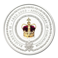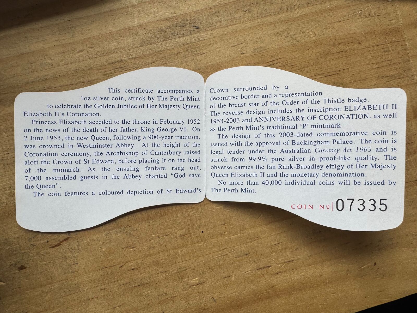 • Reverse inscriptions: ELIZABETH II 1953-2003 and ANNIVERSARY OF CORONATION, plus Perth Mint 'P' mintmark