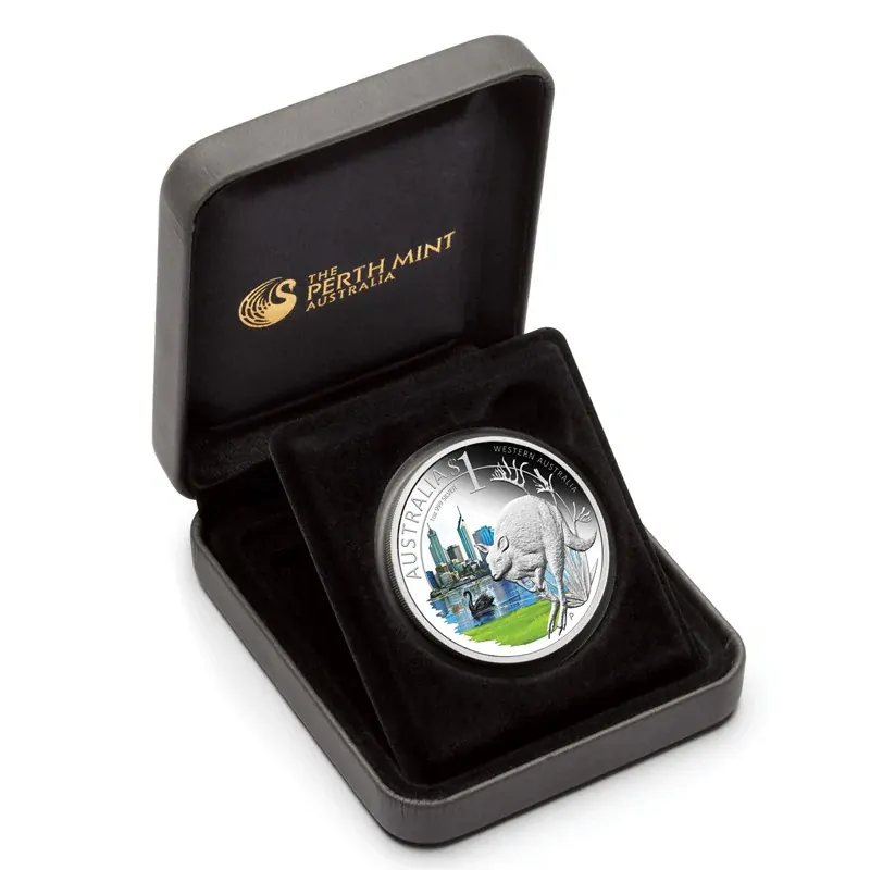 Celebrate Australia with this 2011 Perth Kangaroo 1oz Silver Proof Dollar Coin, released exclusively for the Perth ANDA Coin Show. Struck by The Perth Mint, the coin features the Perth skyline, Swan River, and Kangaroo Paw floral emblem. Limited to just 2,500 coins, each comes in a presentation case with a numbered Certificate of Authenticity.