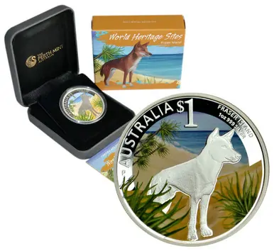 Celebrate Australia’s Fraser Island with this 2013 $1 World Heritage Sites 1oz Silver Coloured Proof Coin from The Perth Mint. Featuring a sandy shoreline and a native dingo, this limited edition silver proof coin includes the ‘P’ mintmark and comes with a presentation box and numbered Certificate of Authenticity.