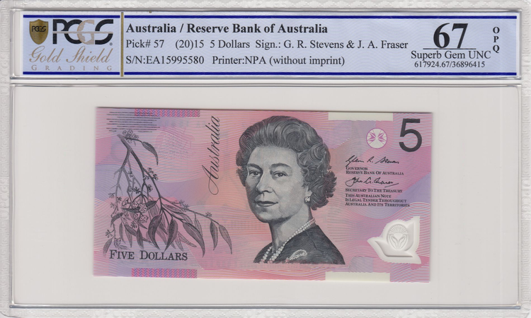 2015 $5 Stevens / Fraser Last Prefix EA15 - PCGS UNC MS67