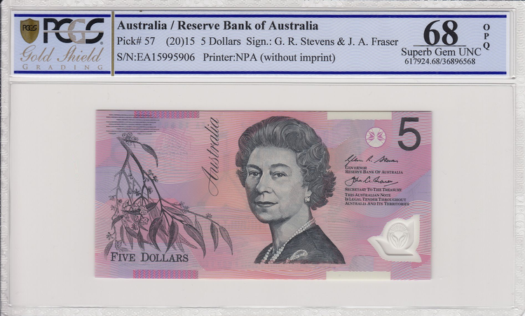 2015 $5 G.R. Stevens & J.A. Fraser Banknote - PCGS Superb Gem UNC 68