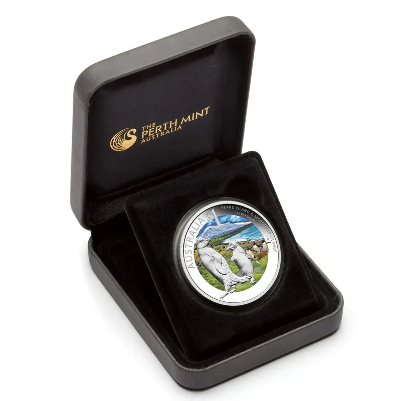 Struck by The Perth Mint for the 2011 Melbourne ANDA Coin Show, this 1oz 99.9% silver proof coin celebrates Heard Island & McDonald Islands. The design depicts macaroni penguins against the islands’ striking landscape. Limited to 2,500 coins, each comes in a presentation box with a numbered Certificate of Authenticity..