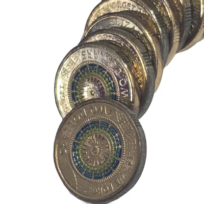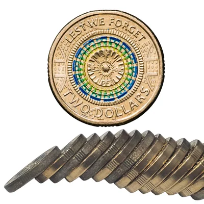 2017 $2 Lest We Forget Mosaic TONED Uncirculated Coin in 2x2. Coin obverse and reverse is beautifully shiny but the edges of the coin are toned/aged due to improper storage of the RAM roll they were taken from.