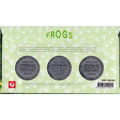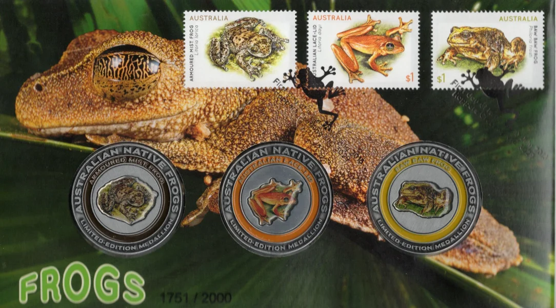 Limited Edition Medallion shows three frog species in Australia that are at risk of extinction.