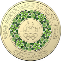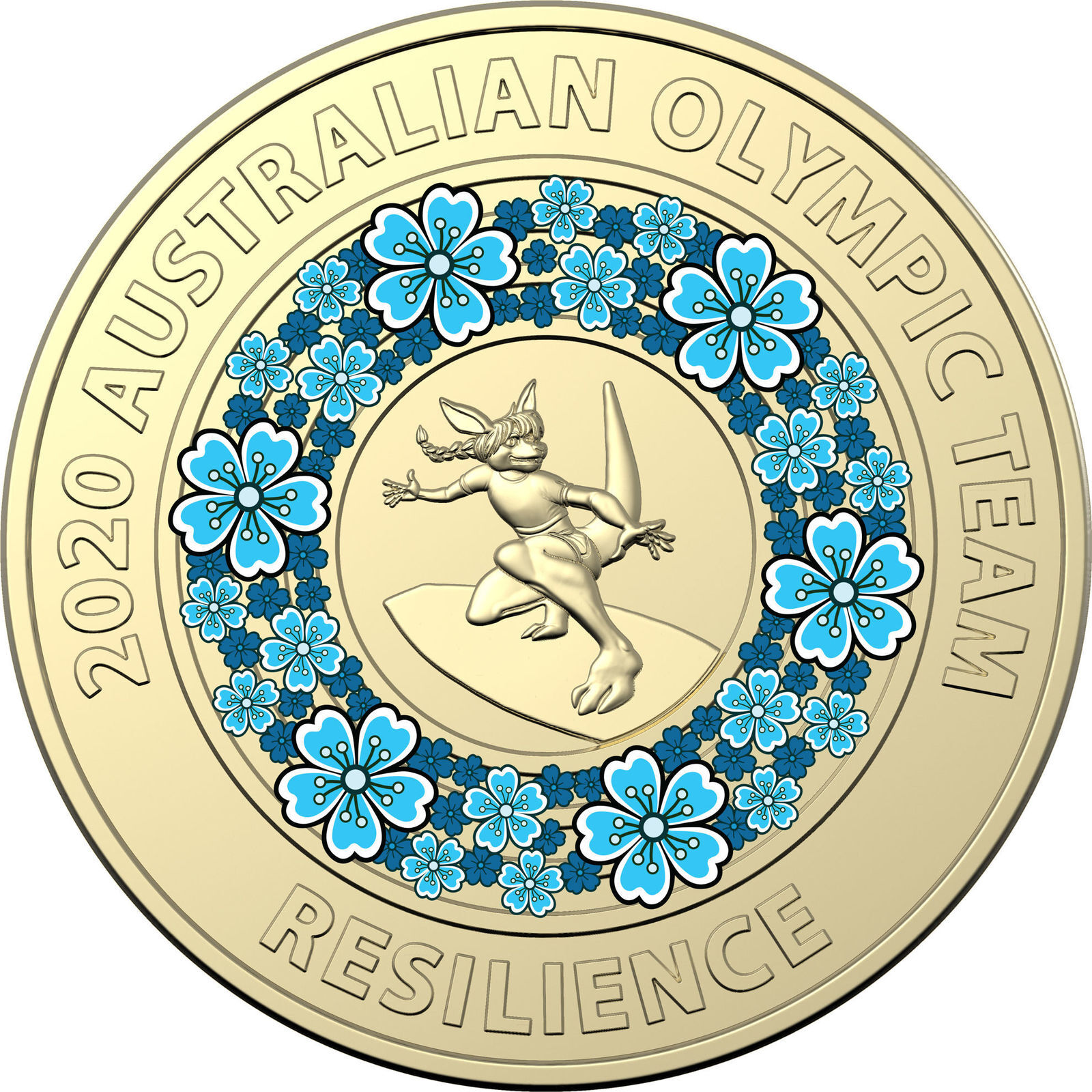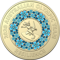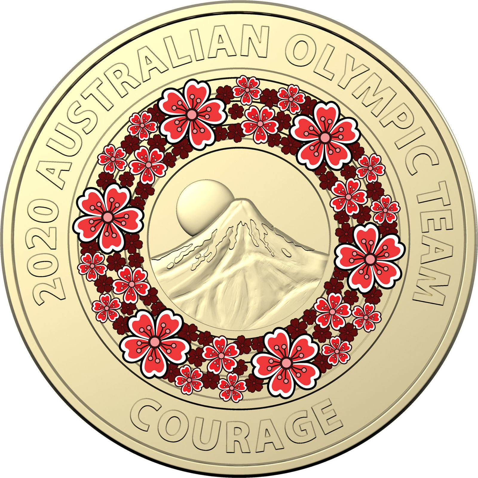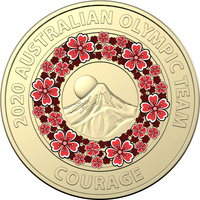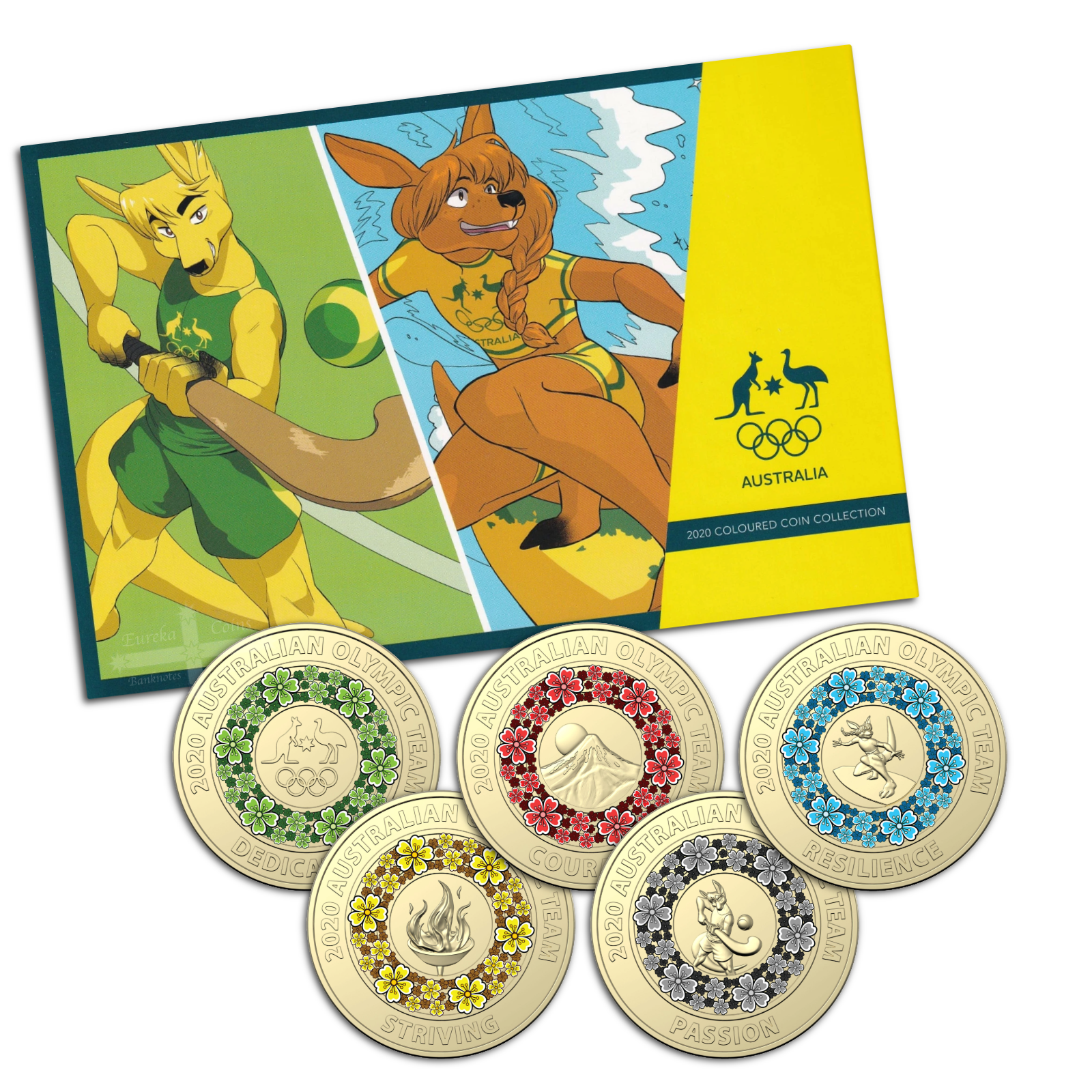 This set includes sive coloured $2 uncirculated coins in a presentation folder, commemorating the Australian Olympic team's journey to Tokyo 2020.