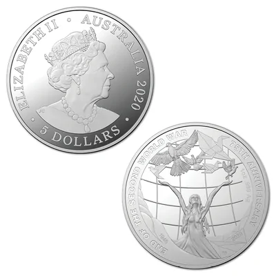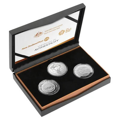 2020 three-coin silver proof set for the 75th anniversary of the end of WWII, featuring Australia $5 1oz, New Zealand $1 1oz and Great Britain £5 silver proof issues. Official RAM, Royal Mint and New Zealand Post collaboration with case, COA and a worldwide mintage of 1,000.