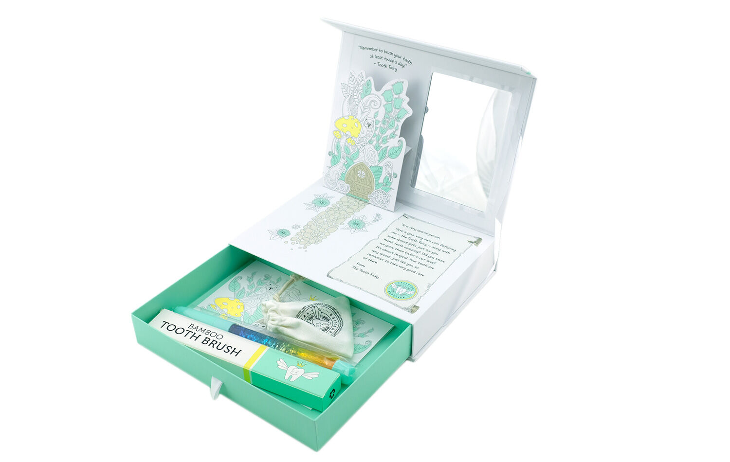 The Tooth Fairy $2 coin in keepsake box. Kit includes uncirculated commemorative Tooth Fairy $2 coin, bamboo toothbrush, tooth chart and glitter pen along with a special message from the Tooth Fairy herself.