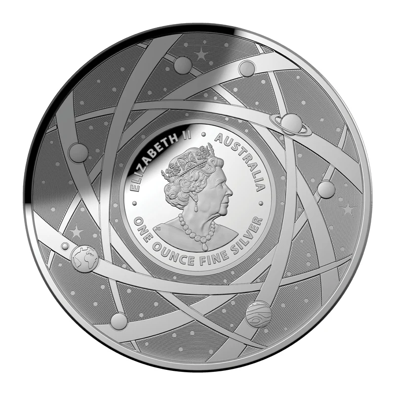 The obverse features Her Majesty Queen Elizabeth II, surrounded by a representation of the Solar System’s planetary layout. Minted to a high Proof standard, the combination of colour, curvature, and fine detailing makes this coin a standout piece for collectors of astronomy-themed issues and modern Australian numismatics.