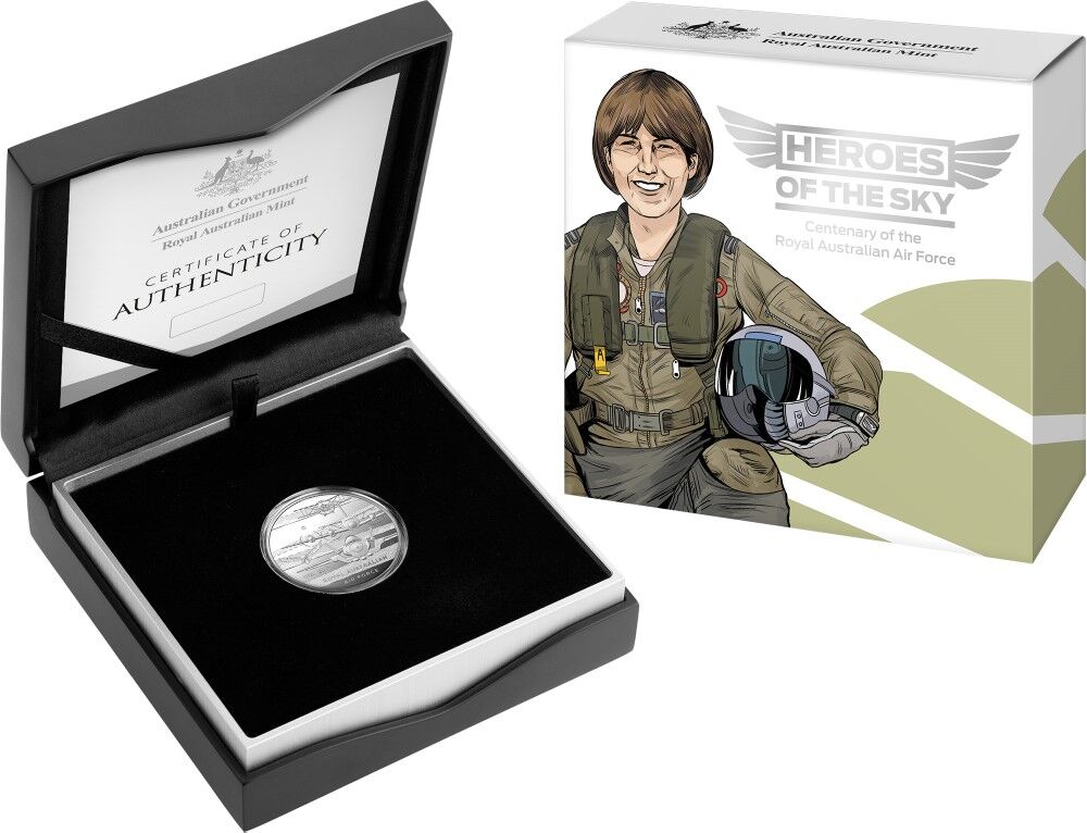 Format 1oz silver proof coin, ‘C’ mintmark, RAAF Centenary design, Queen Elizabeth II Jody Clark effigy, presentation case with numbered certificate, mintage 5500