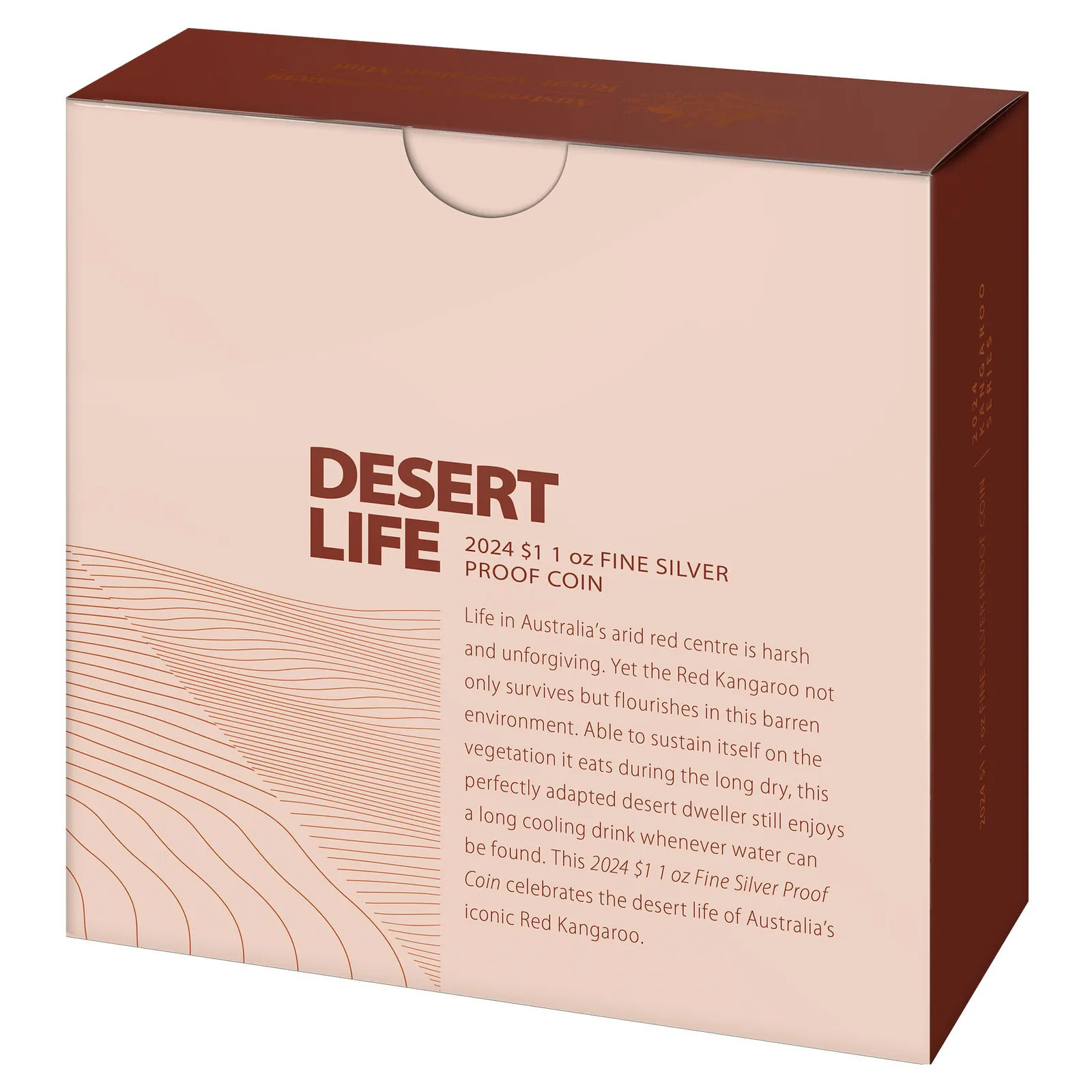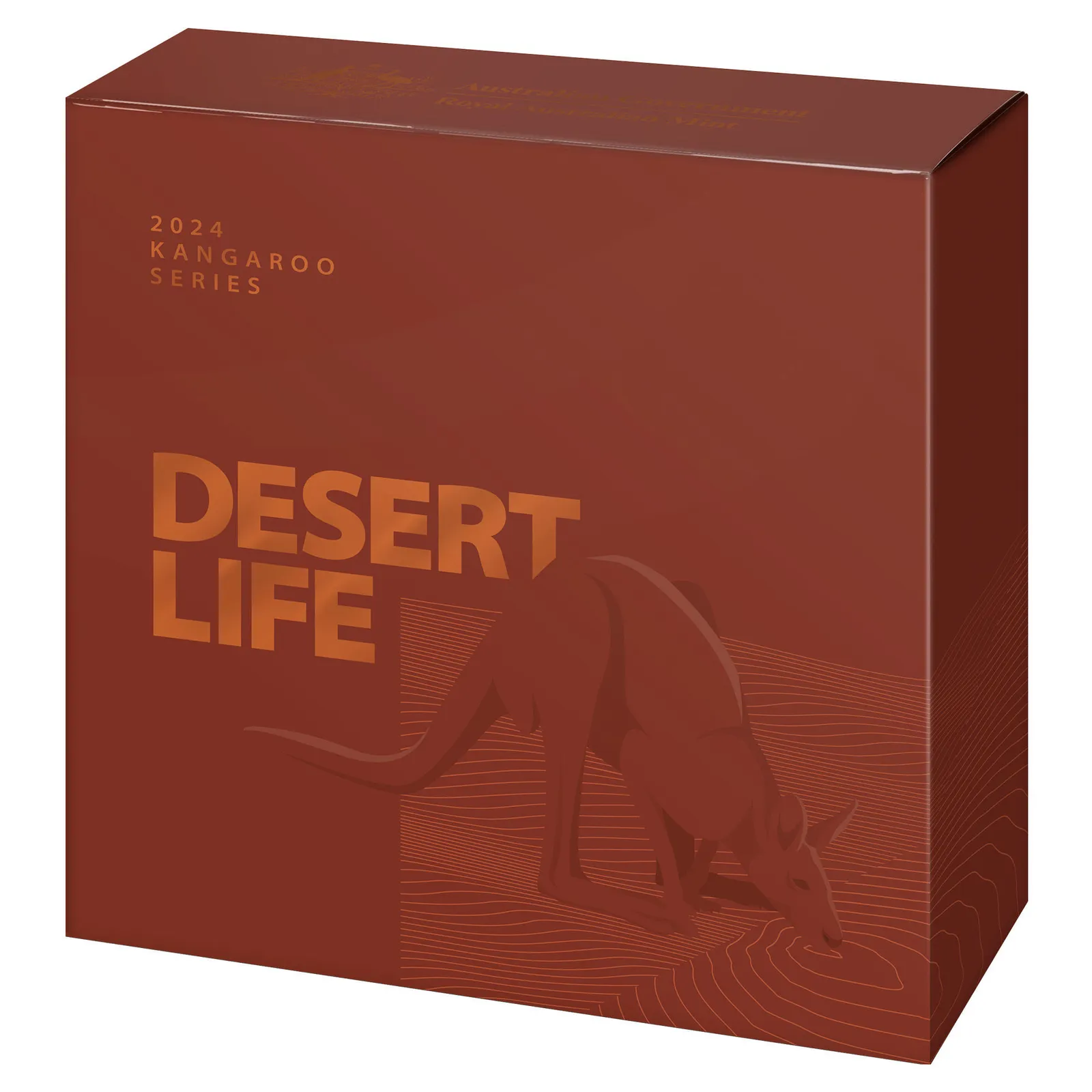 Format 2024 RAM Kangaroo Series 1oz Fine Silver Proof Coin – Desert Life; $1 Australian legal tender; 99.9% pure silver; proof finish; limited mintage 5000; 40mm diameter; 31.1g weight; includes Certificate of Authenticity; RAM official packaging.
