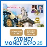 Produced by Australia Post exclusively for ANDA's Sydney Money Expo 2025 with expo overprint and limited numbering. This Postal Numismatic Cover is highly collectable, featuring a pictorial envelope with 2025 circulating AlBr $1 and $2 coin.
