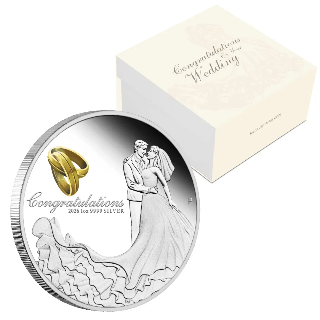 Crafted from 1oz of 99.99% pure silver with a flawless finish, this wedding coin is the perfect gift for a couple starting their new life together. This coin captures a tender moment between a bride and groom wrapped in an affectionate embrace on their special day, along with two intertwined coloured gold wedding bands representing commitment and unity. The design includes the inscription ‘Congratulations’, and The Perth Mint’s traditional ‘P’ mintmark, along with the coin’s weight, fineness and 2026 year-date.