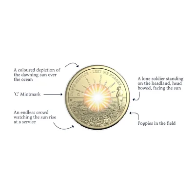 • Coin reverse features a striking representation of the dawn service, including colour print