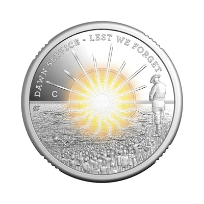 • Coin reverse features a striking representation of the dawn service, including colour print and the 'C' mintmark for Canberra, the place of minting