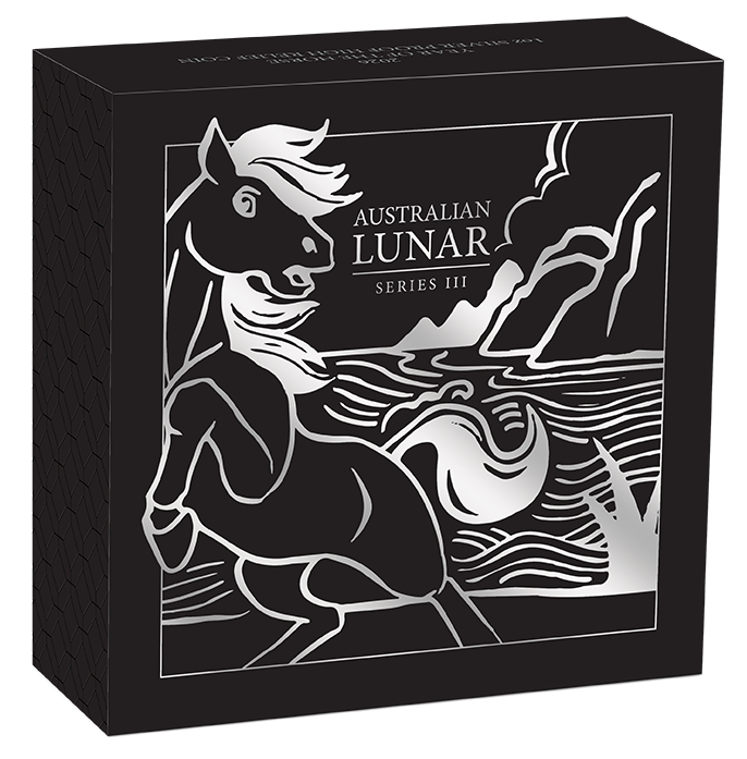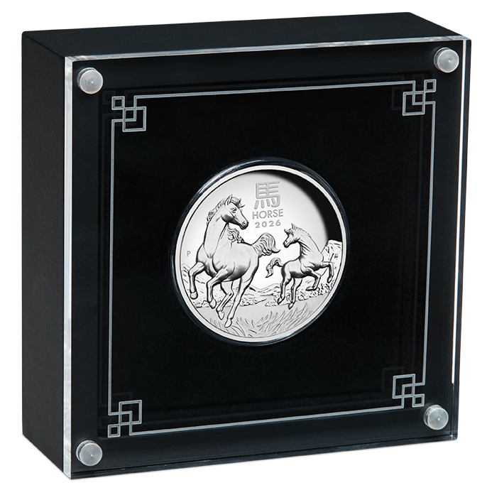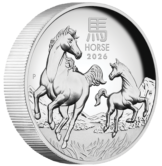 The 2026 Australian Lunar Series III Year of the Horse 1oz Silver Proof High Relief Coin is a finely struck proof from The Perth Mint, struck in 99.99% pure silver with a gross weight of 31.107 g. The reverse features a detailed high-relief design by Ing Ing Jong — a graceful mare and her foal mid-gallop across an open mountain and grassland scene, accompanied by the Chinese character for “Horse”, the inscription “HORSE 2026”, and the Mint’s “P” mark. On the obverse, the coin bears the official effigy of King Charles III, by designer Dan Thorne, plus standard inscriptions for weight, purity and denomination.