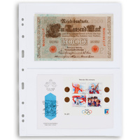 Crystal-clear welded strips cover your collector's pieces to provide optimum protection with double-sided view. Clear, with 2 horizontal stripes. Particularly suitable for storing banknotes up to DIN A5, graded banknotes. GRANDE sheets made of clear synthetic material. Document quality, free fom both chemical softeners and acids.