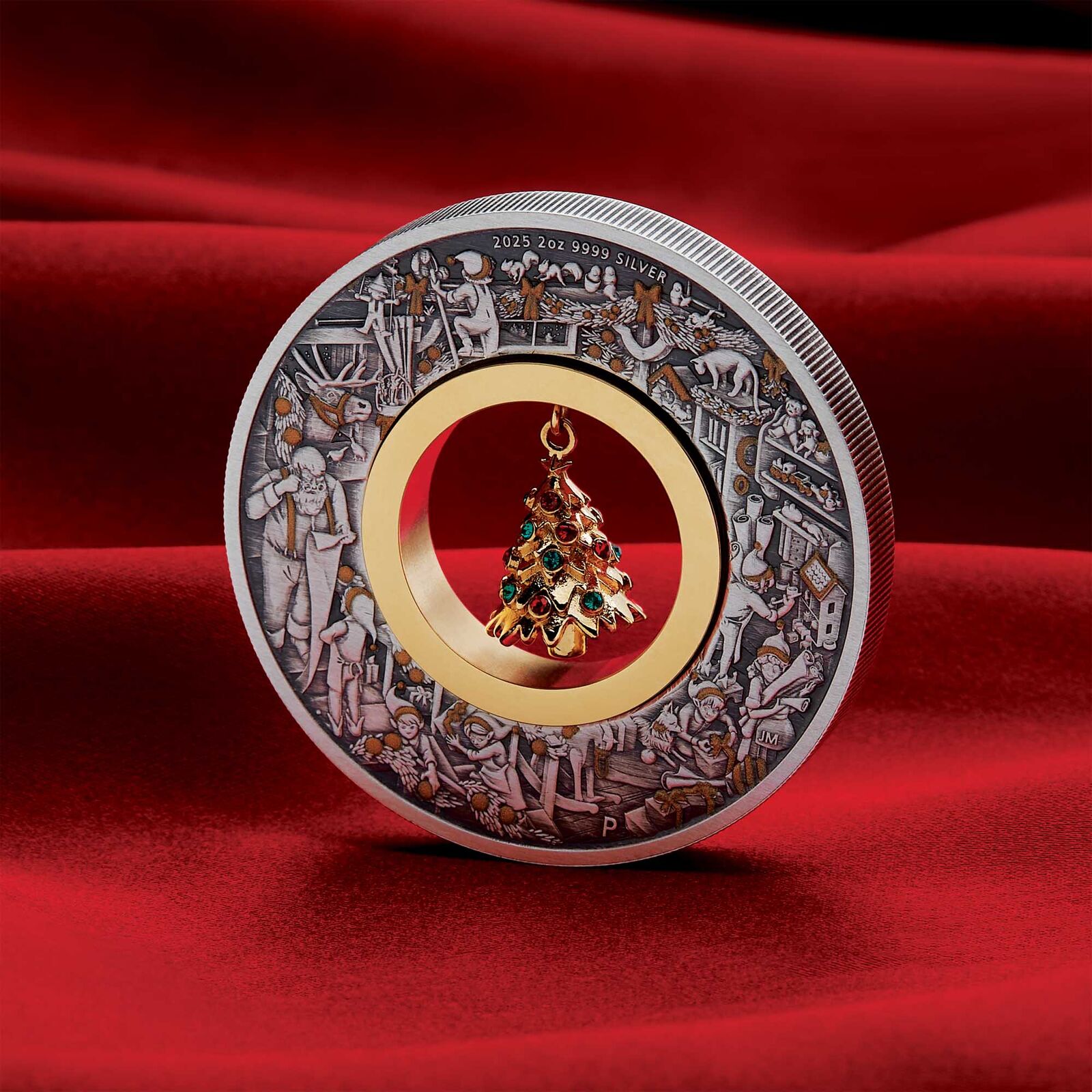 Santa’s Workshop comes to life in this festive 2025 release from The Perth Mint, beautifully rendered in 2 troy ounces of 99.99% pure silver. The reverse of the coin features a busy North Pole workshop, where elves are crafting toys and Santa checks his famous list. At its centre swings a finely detailed 24 ct gold-plated Christmas tree, adorned with Swarovski™ crystal baubles. Each coin is individually antiqued, giving it a rich, artifact-like finish that varies subtly across the mintage. The coin sits in a clear-lidded display case, housed inside a gold-foiled Christmas gift box with a bow, and comes with a numbered Certificate of Authenticity.