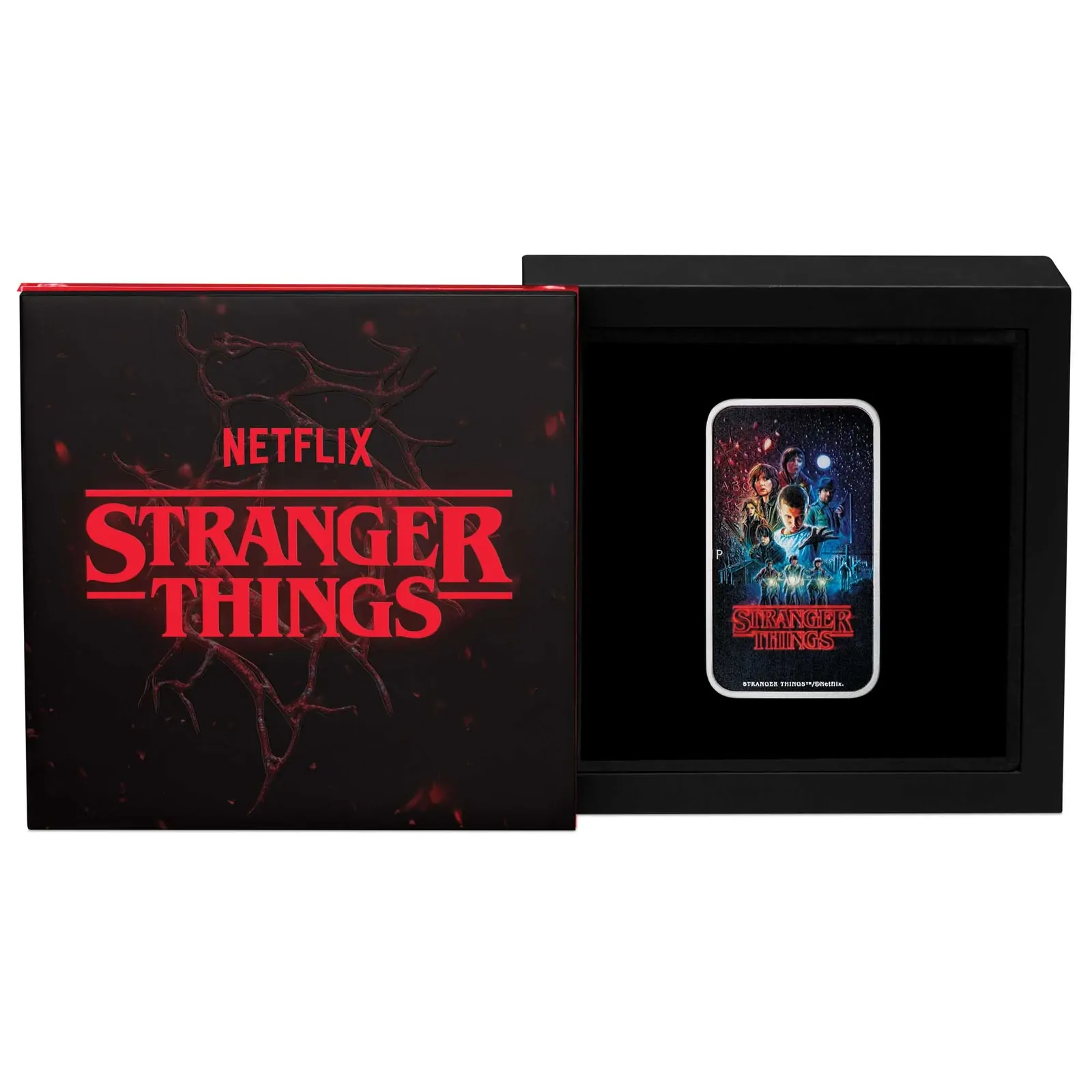 The coin is housed in a black wooden case with red accents. The lid of the case features embossed details, as well as the official Netflix and Stranger Things logos. Packaged in a themed shipper, the release is accompanied by a numbered certificate of authenticity.